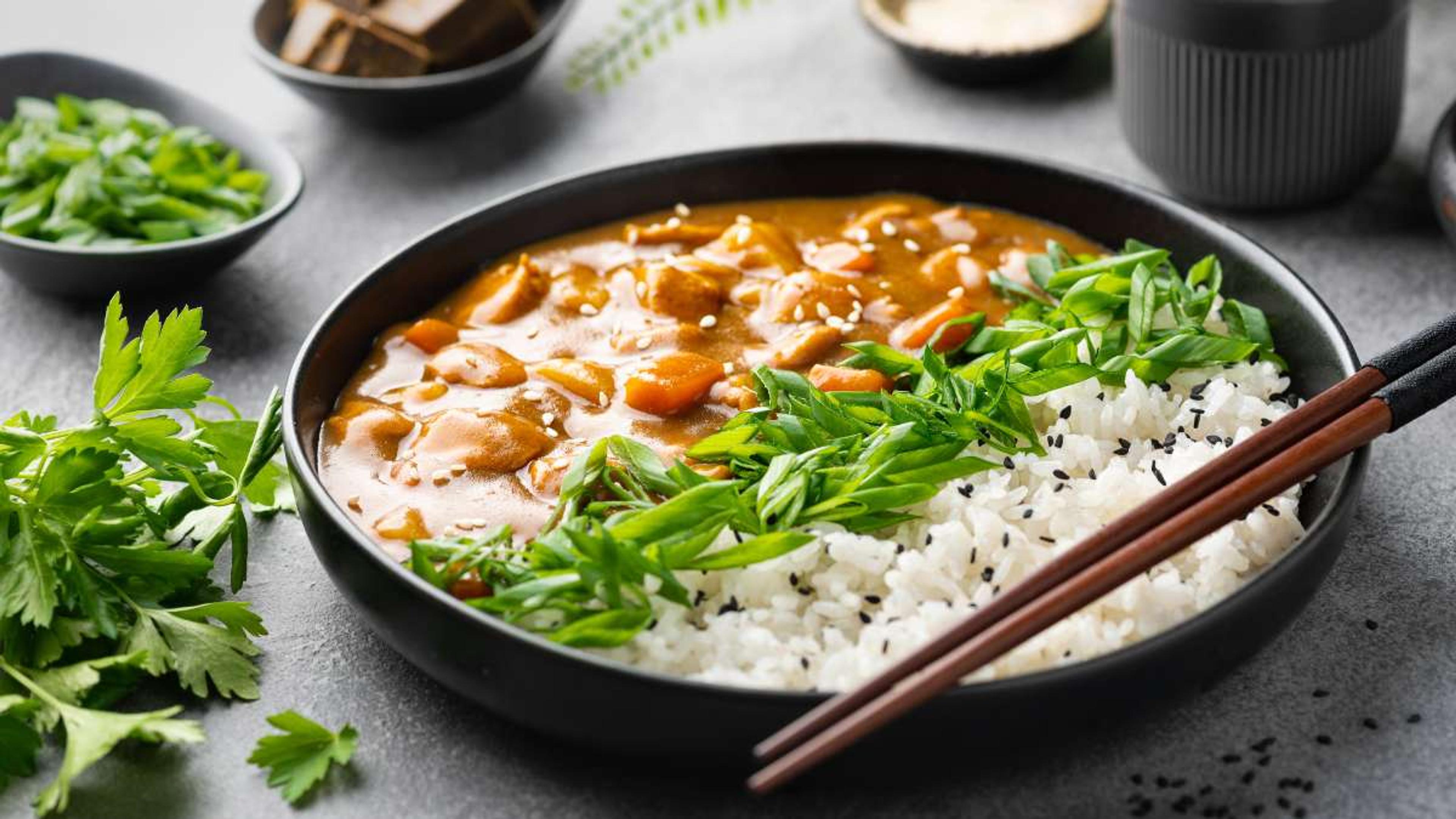 Vegan curry is a popular plant-based version of traditional Japanese curry. It features chunks of vegetables that are stewed in a rich and flavorful curry sauce.